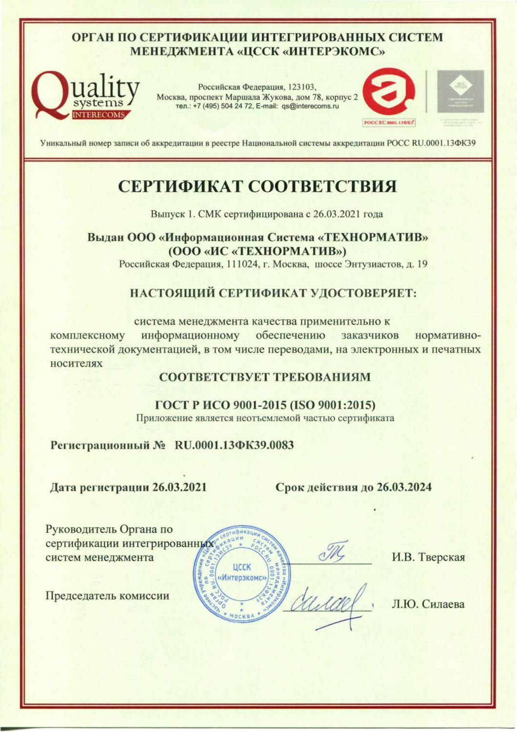Система менеджмента качества нашей компании успешно функционирует и сертифицирована в соответствие со стандартом ГОСТ ISO 9001 применительно к комплексному информационному обеспечению стандартами и нормативно-технической документацией, в том числе выполнения переводов документации.