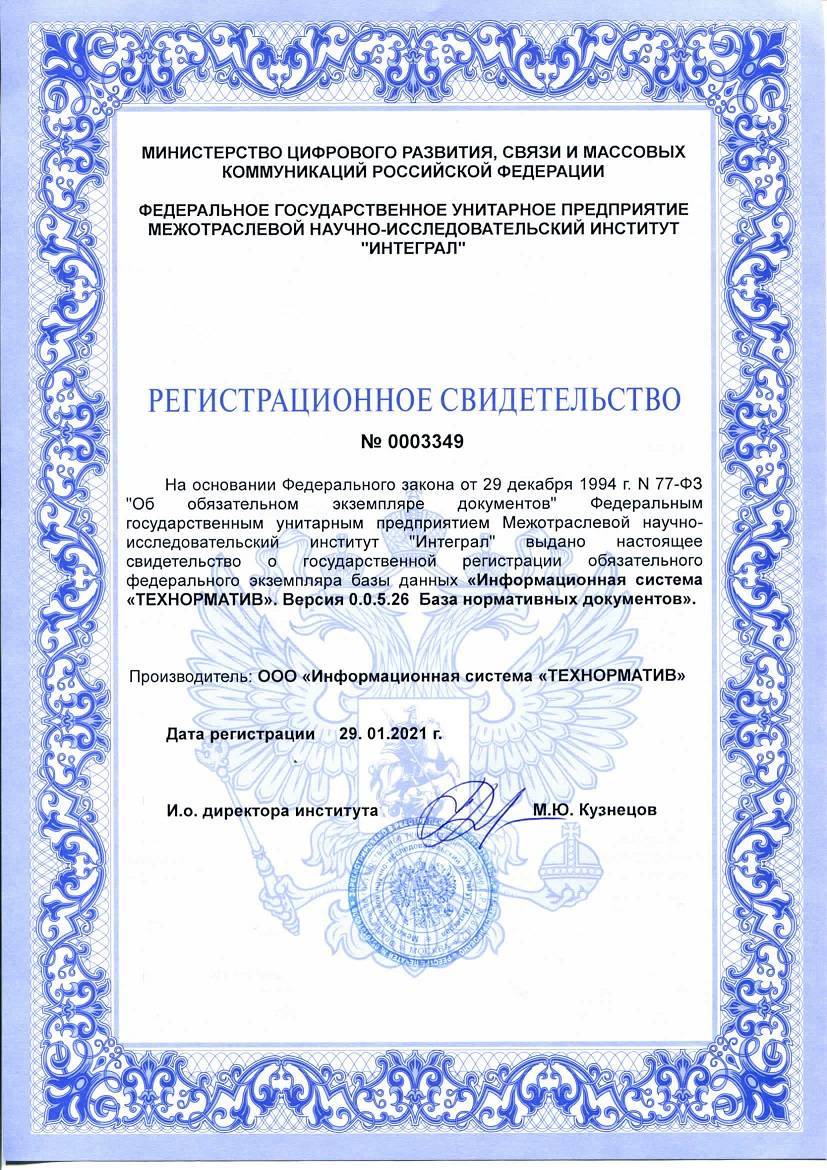 Програмное обеспечение "Информационная система "Технорматив" занесено в реестр российского программного обеспечениия. Запись в реестре №12956 от 25.02.2022 г. произведена на основании поручения Министерства цифрового развития, связи и массовых коммуникаций Российской Федерации от 25.02.2022 г. по протоколу заседания экспертного совета от 21.02.2022 №242пр.